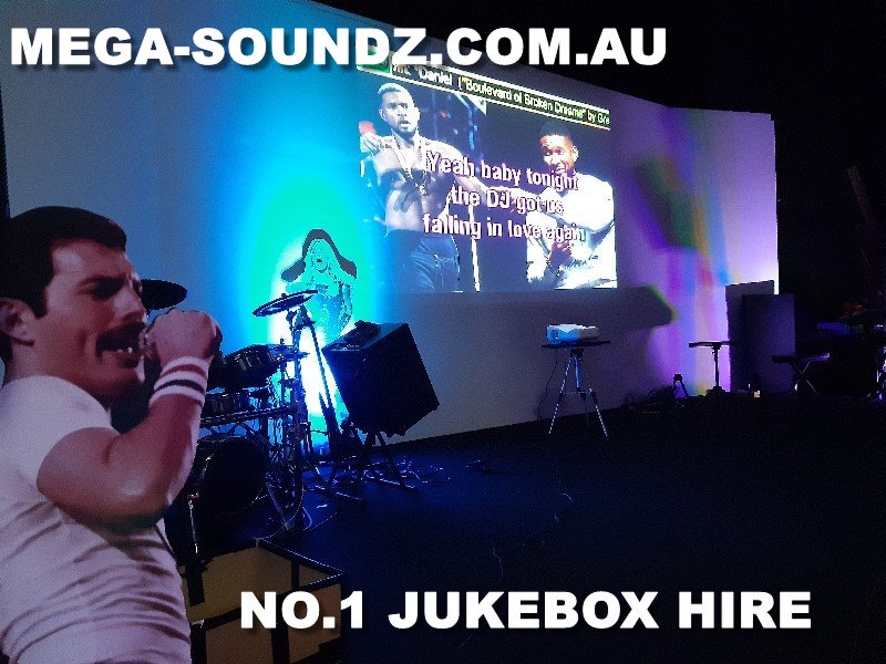 100″ Screen showing karaoke songs with pictures of the artists in the background making this a much more visual as well as just an audio experience.