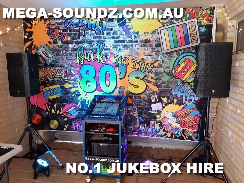 Jukebox hire Perth. DJ quality sound without the cost, our machines are far superior than others on the market. With a BIG song selection via the touchscreen monitor and quality sound from 2 speakers on stands. Also supplied with Aux Cord and Bluetooth to connect your devices and a microphone for speeches. We even supply 3 great disco lights to set up that party atmosphere. Updated weekly.